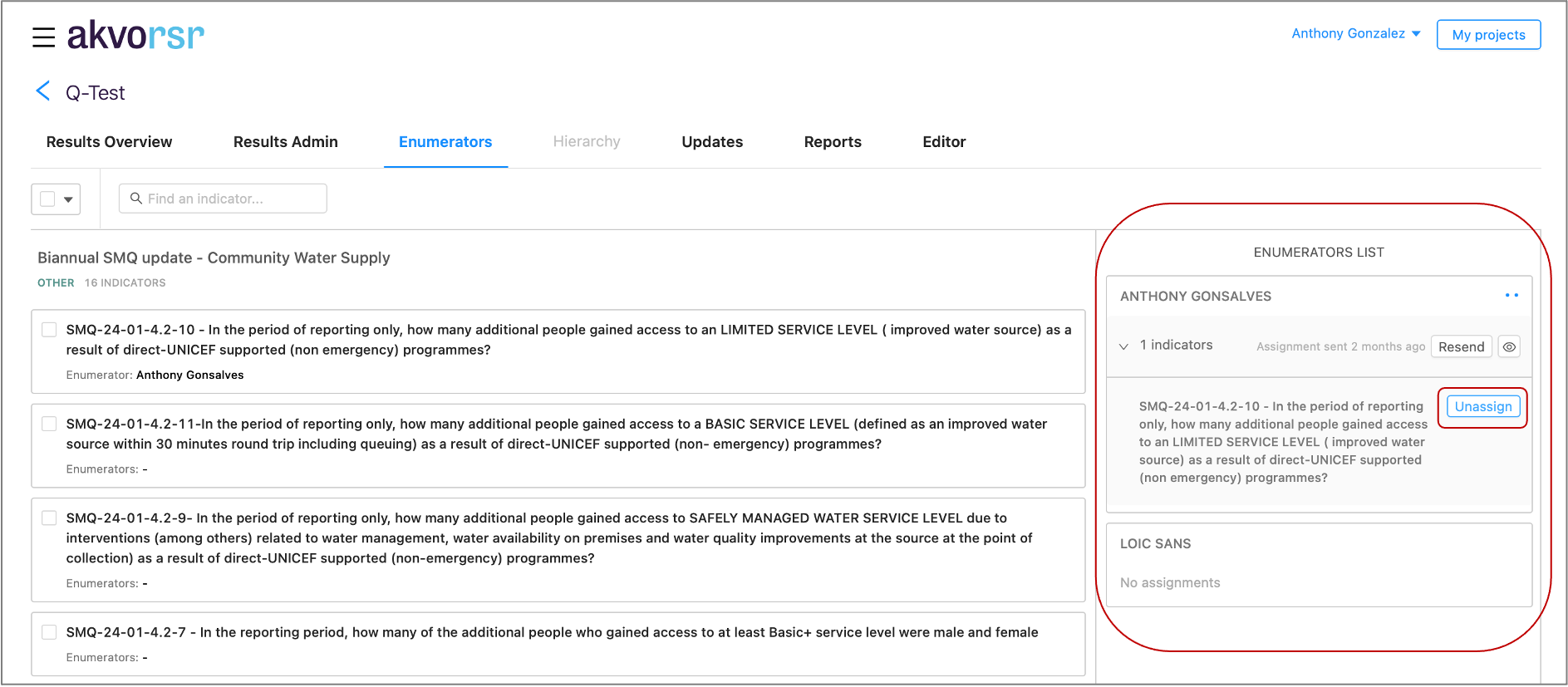 In the Enumerators List, if you click below the name of the Enumerator on the arrow (next to the number of indicators) a list will appear. From here you can see which indicators have been assigned to that enumerator and you can also Unassign an indicator if needed.