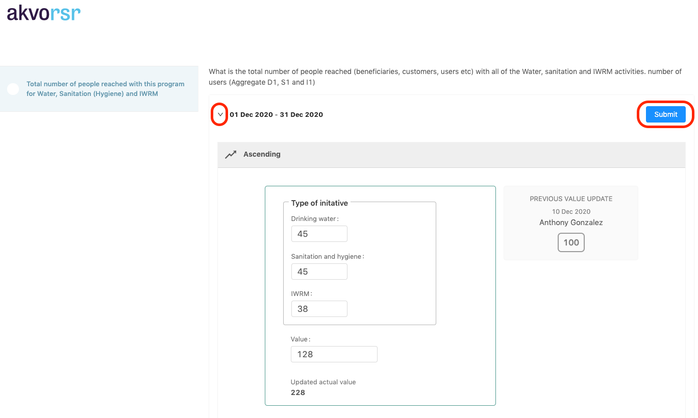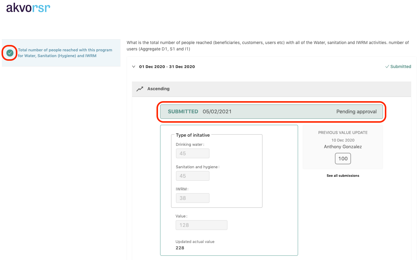Once you have entered the values (and if needed, added additional comments or files), you can submit by clicking on the blue Submit button. If the submision has gone well, you will see a check icon in front of the indicator on the left. A message will then appear stating the date and that your submission is pending for approval.