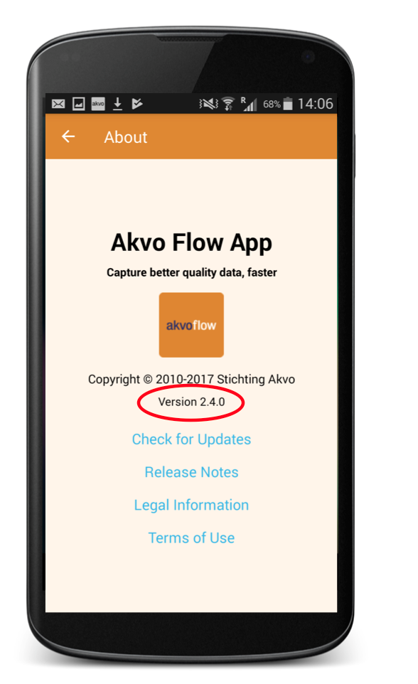 About holds all the basic information you need to know about the Akvo Flow app, as the version you are running, if there is a new version available, what changes have we made in the release note, or our terms of use.