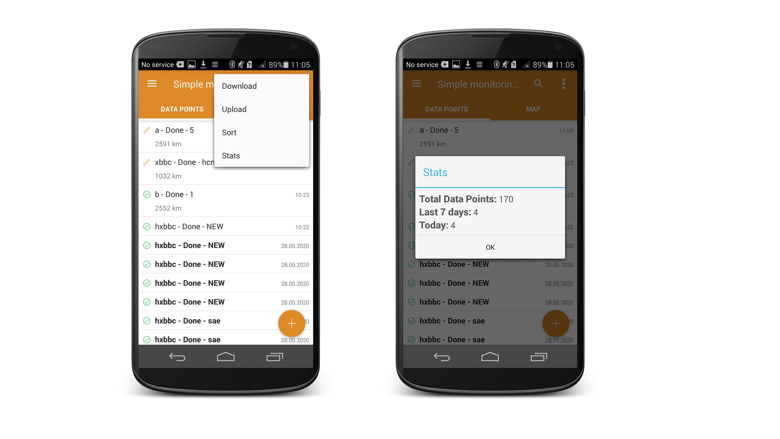 You can also see an overview of the data point statistics, by clicking on Stats located under the overflow menu icon. The stats show you: the total number of data points on your device,
