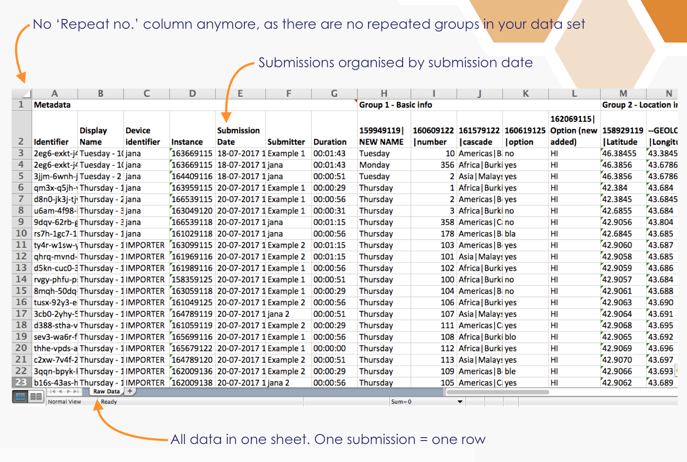 - In the repeated question group sheets one repetition sits in one row and all meta data is copied to all rows, so a submission can be shown in more than one row. The 'Repeat no' column indicated the number of repetitions per submission.* (Please note the change in the title where we removed the '.' - full stop - from the title.)*